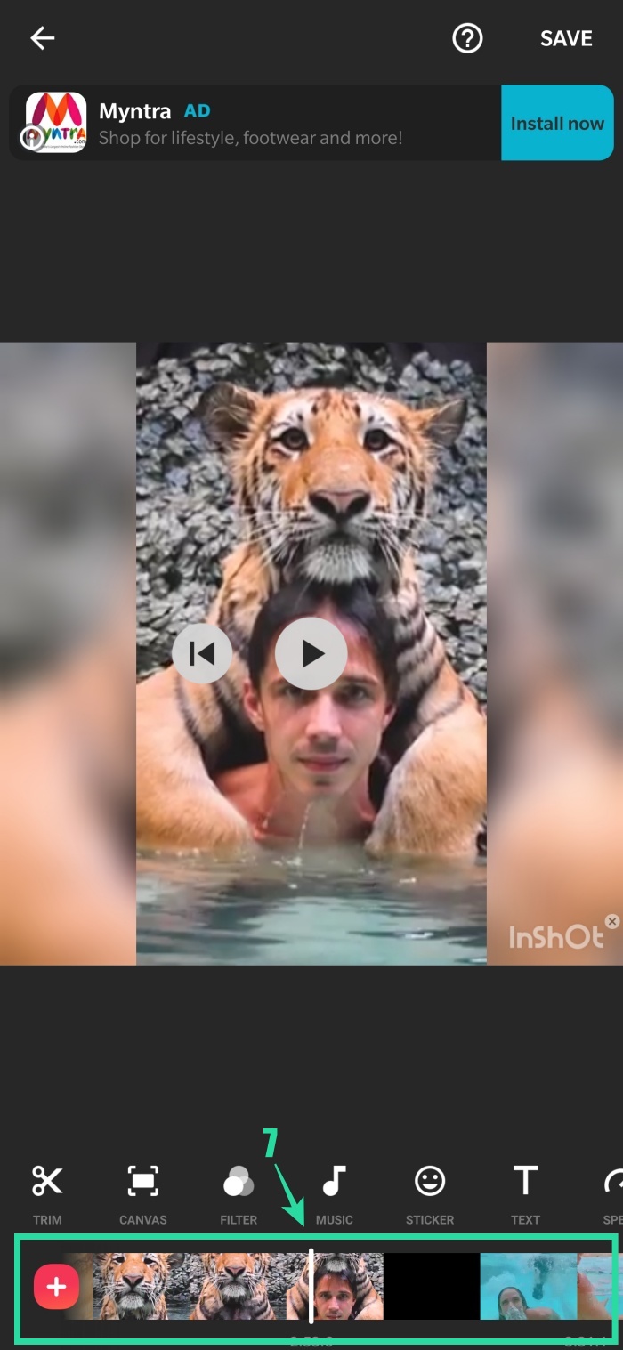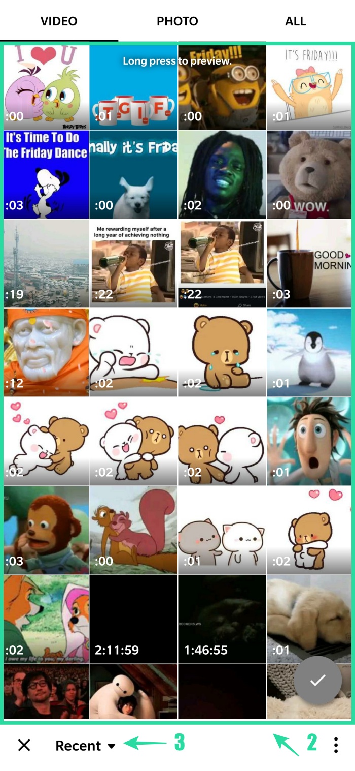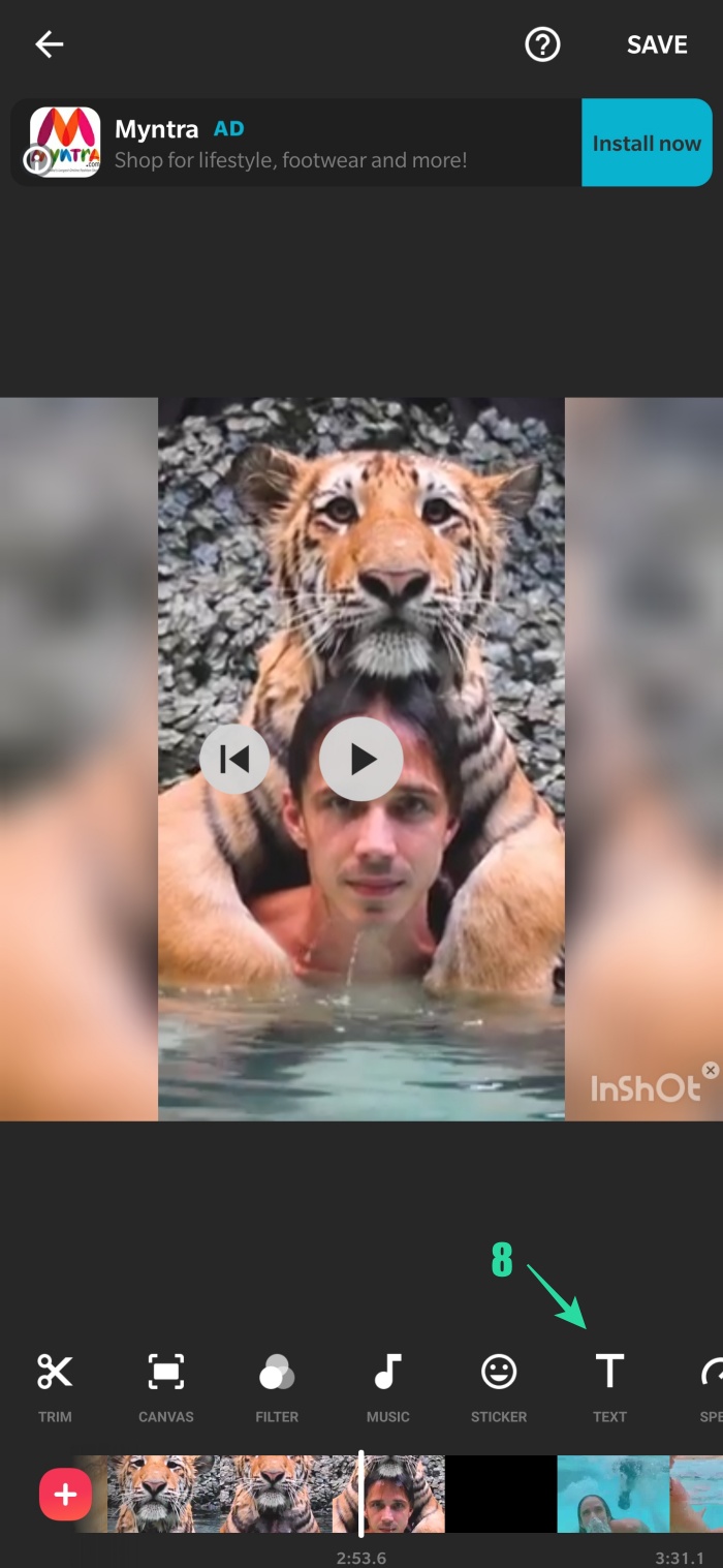 Install the InShot app from Google Play and once it’s installed, open it. Tap on the ‘Video’ tile, select the video you want to add texts to, and then tap on the tick mark bubble at the bottom right to start editing. This should open the editing interface of the InShot app.