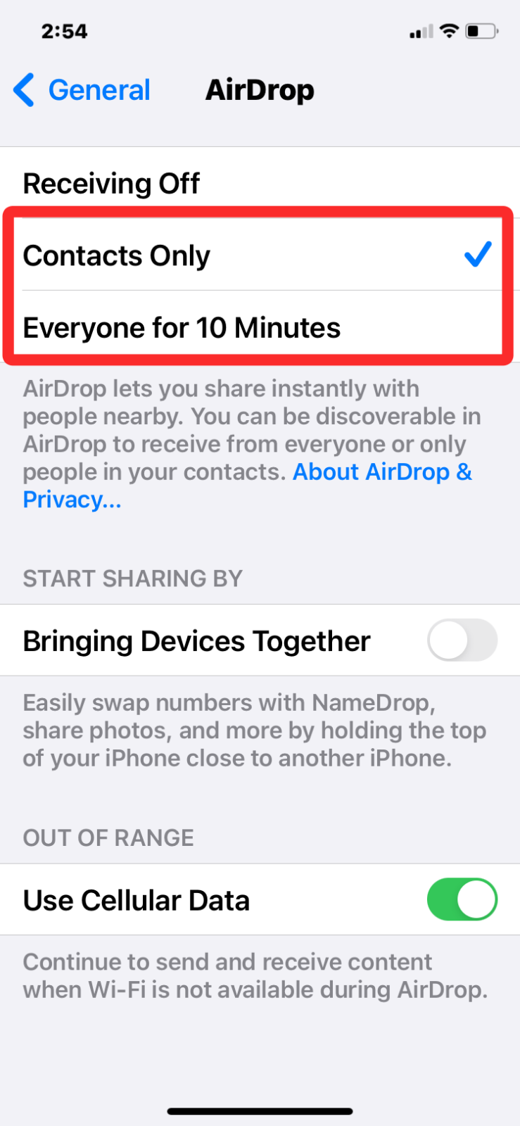 4. From the menu that appears, choose Contacts Only to receive files from people in your contact or your own devices. If you’re about to receive files from someone who isn’t on your contacts list, you can select Everyone instead so that your iPhone is discoverable for all Apple devices around you.