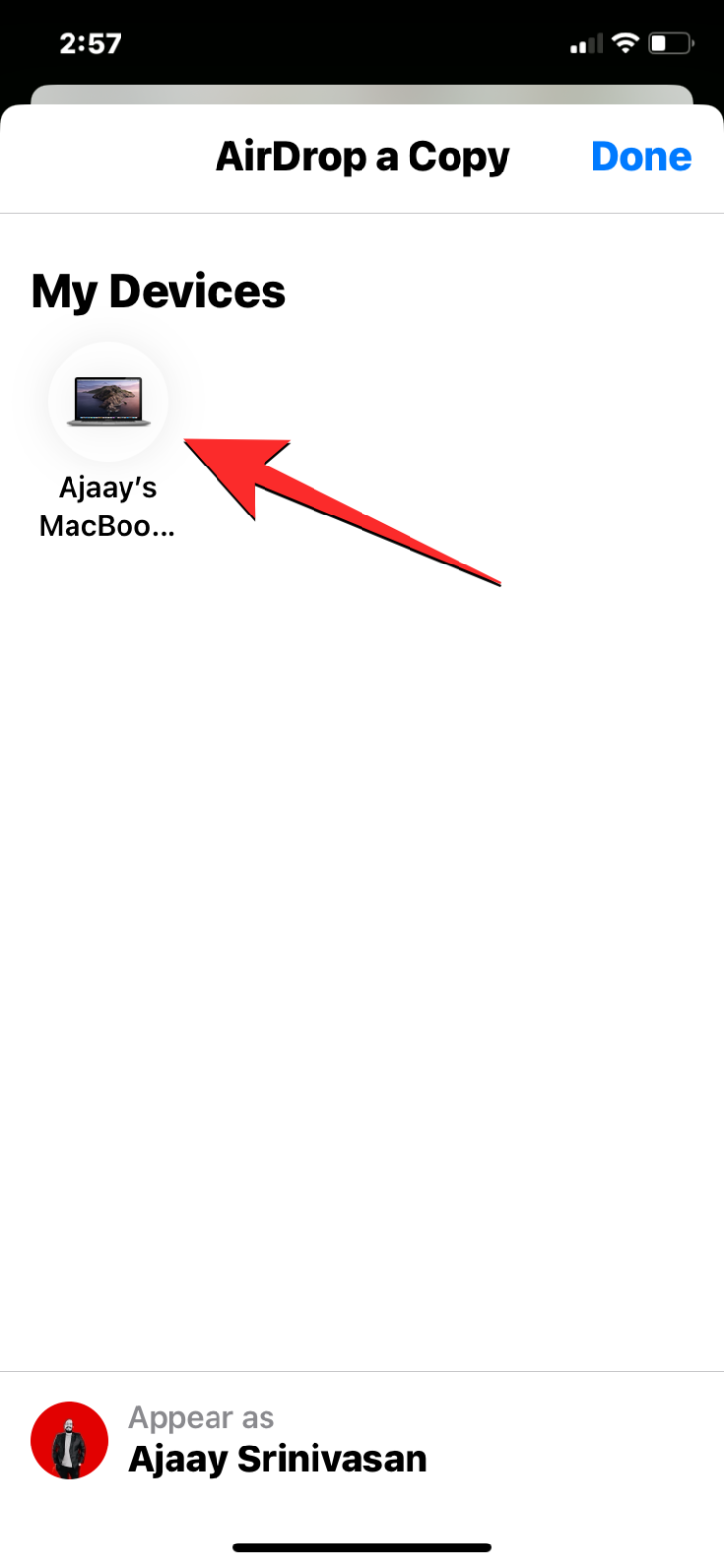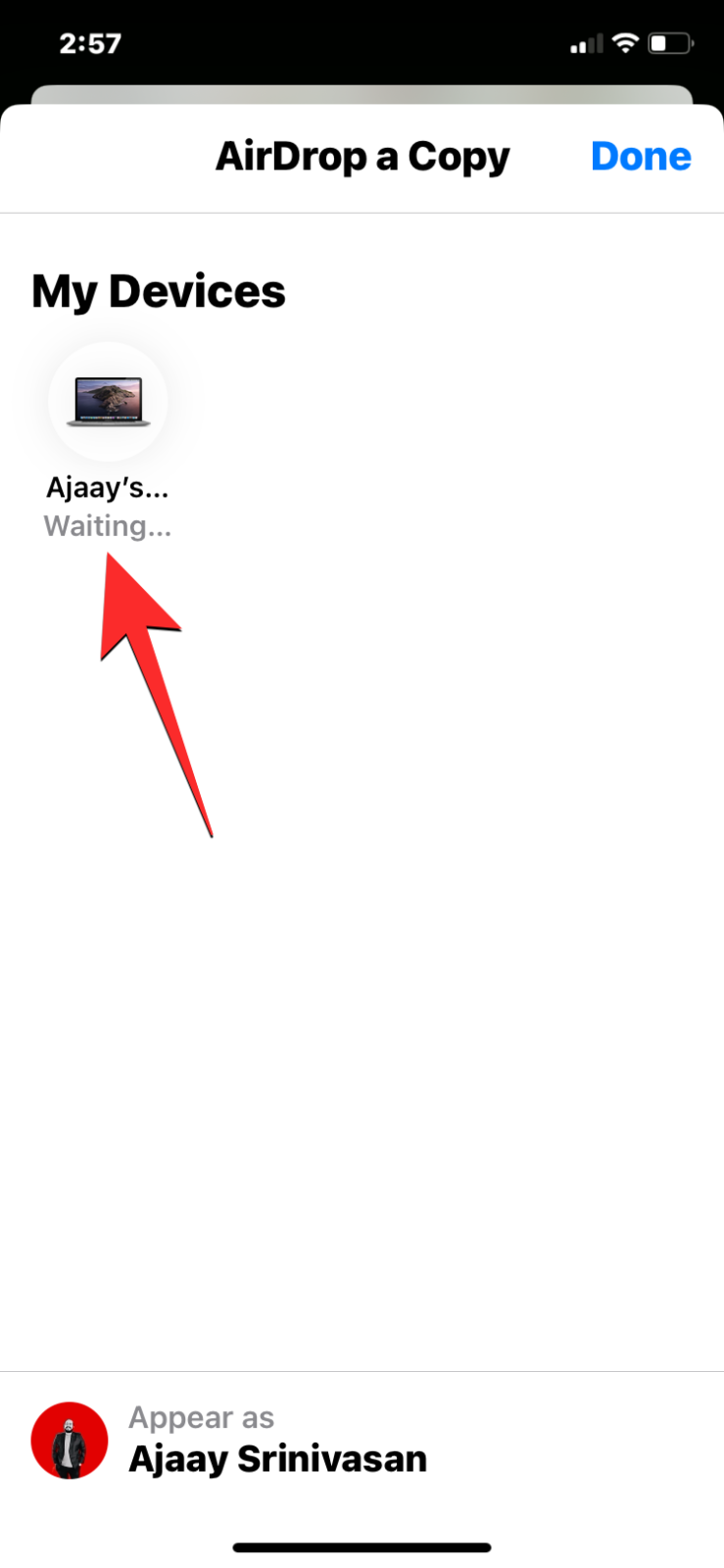 2. You will see the AirDrop screen appear showing a list of Airdrop-enabled devices in your surroundings. To transfer the file to your Mac, choose it from this list for the transfer process to begin. You will see the “Waiting” message when AirDrop waits for the recipient’s approval.