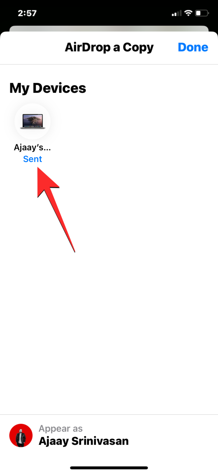 3. Once the recipient accepts the AirDrop transfer, the message you will see a “Sending” message. Once the files are sent, you will see the “Sent” message inside the Airdrop screen.