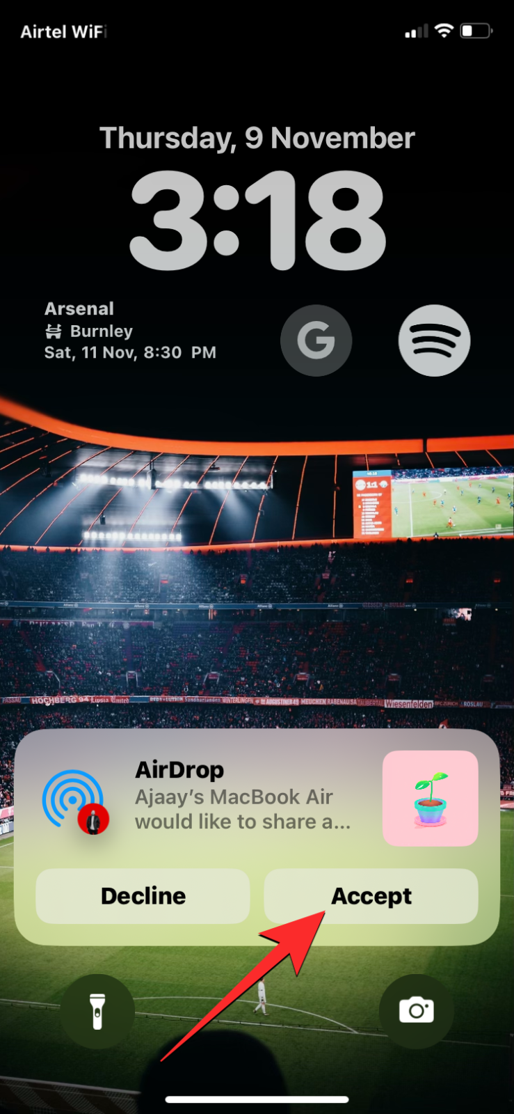 1. When someone or your own iPhone is attempting to send you files using AirDrop, you will be alerted with a notification at the top right corner of your screen. The notification will read that a device is dying trying to send a particular file. If the message is from a device you know, then click on Accept. If not, click on Decline to prevent the device from sending you files.