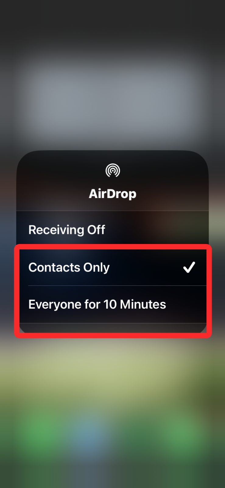 2. Tap and hold the Airdrop icon to get more options. When the AirDrop menu appears, choose Contacts Only to receive files from people in your contact or your own devices. If you’re about to receive files from someone who isn’t on your contacts list, you can select Everyone for 10 Minutes instead so that your iPhone is discoverable for all Apple devices around you.