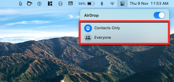 You can turn on AirDrop on your Mac by going to Menu Bar > Control Center icon > AirDrop and choosing either Contacts Only or Everyone from the overflow menu.