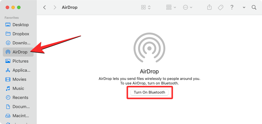 2. Inside Finder, click on the AirDrop tab from the left sidebar. Inside the AirDrop window, click on the Turn On Bluetooth button to proceed.