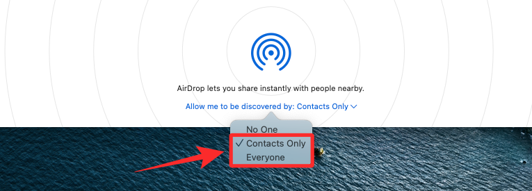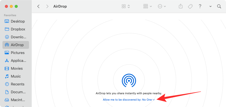 You can also use the Finder app on your Mac to enable AirDrop. For this, go to Finder > AirDrop > Turn On Bluetooth and then click on the Allow me to be discovered by: No One dropdown menu. From the overflow menu that appears, select Contacts Only or Everyone