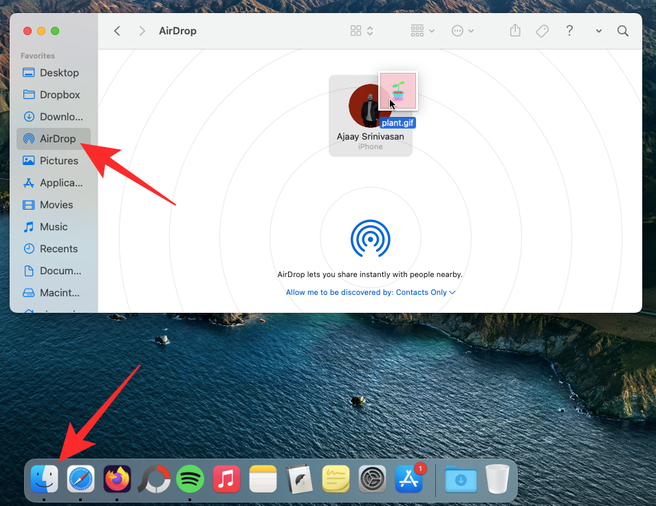 Alternatively, you can open the Finder app, go to the Airdrop tab from the left sidebar, and check whether the person you want to send to is visible inside the Airdrop window. If yes, select the files you want to share from another Finder window and drag them to the person or device’s thumbnail inside the Airdrop window.