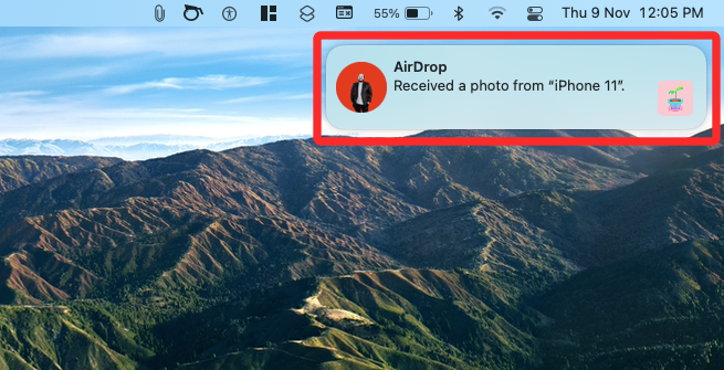 When an iPhone or other Apple device attempts to share a file with you over AirDrop, you will see an AirDrop notification at the top right corner. You can click on Accept to start receiving this file over AirDrop. This notification only appears when you’re receiving files from someone else’s device. If you’re sharing something from your iPhone, the file will be sent directly and you will only get a notification when you receive the file.