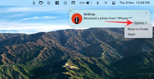 3. You can hover the mouse over this notification and click on Options to either open this file or locate it on your Mac.