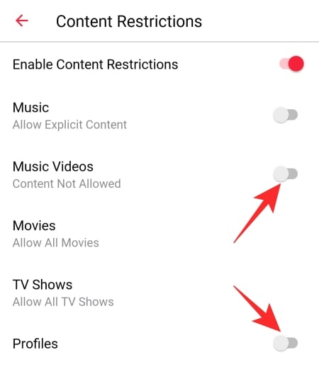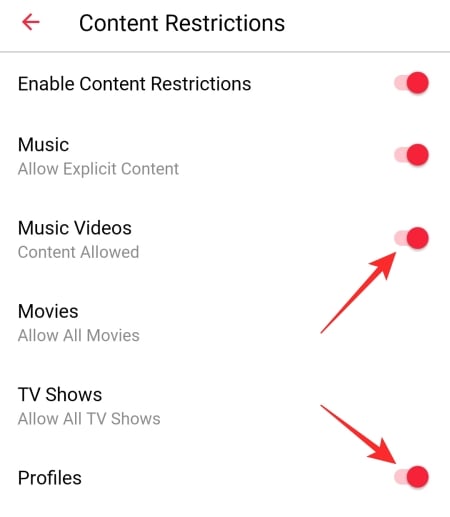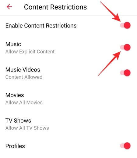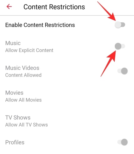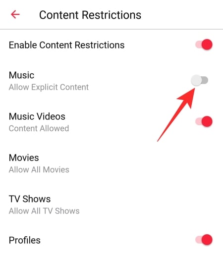 However, if you want more control over what’s permissible in Apple Music, you’ll have to leave the ‘Content Restriction’ toggle on. Now, to block explicit content in music, toggle off ‘Music(Allow Explicit Content).’
