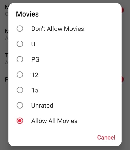 You’ll get the following options: ‘Don’t Allow Movies,’ ‘U,’ ‘PG,’ ’12,’ ’15,’ ‘Unrated,’ and ‘Allow All Movies.’