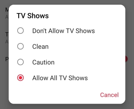 A menu would open up with the following options: ‘Don’t Allow TV Shows,’ ‘Clean,’ ‘Caution,’ and ‘Allow All TV Shows.’