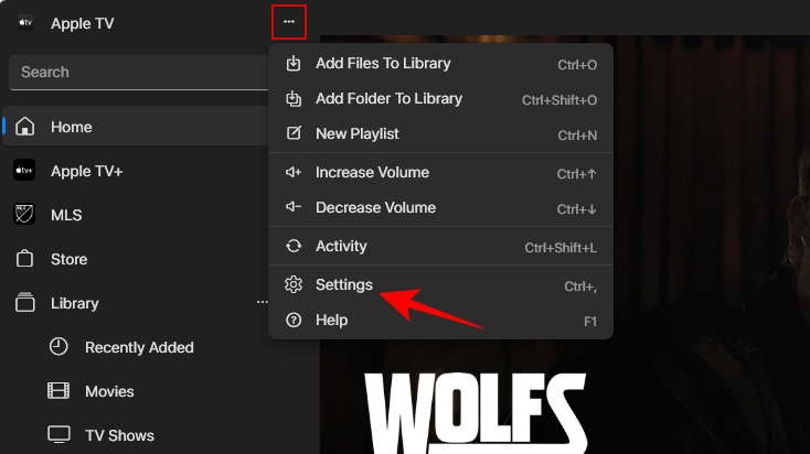 Open the Apple TV app. Click on the three-dot icon in the top left corner, and select Settings.
