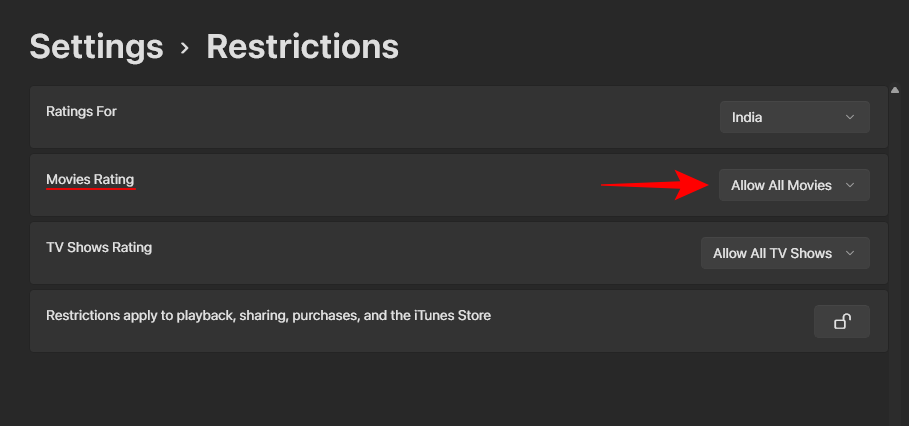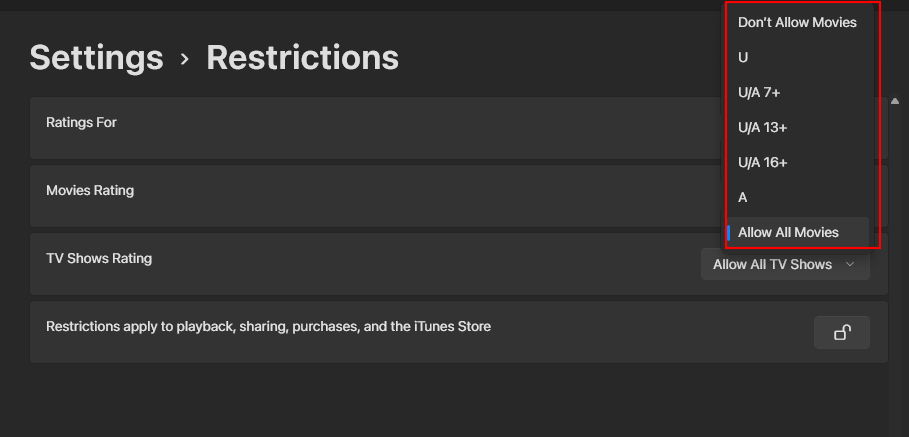 To restrict movies, click on the drop-down menu next to Movies Rating.