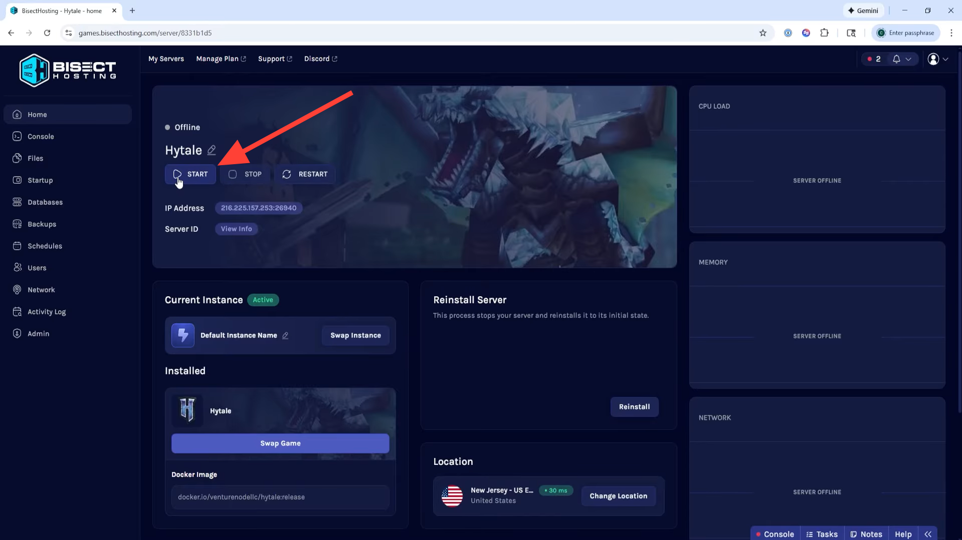 Log in to your hosting provider’s control panel (such as the BisectHosting Starbase panel), locate your Hytale server, and click Start to launch it.