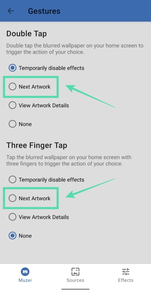 Step 2: Here, you can enable two types of gestures – double tap on the home screen or three-finger tap on the home screen for the wallpaper to be changed automatically. To do so, tap on the Next Artwork option under either of the gesture options.