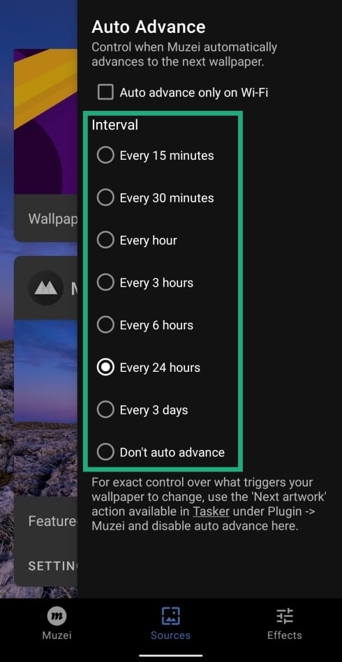 The Auto-Advance Settings page also lets you choose whether or not you want Muzei to download wallpapers using only WiFi or through any network. To enable WiFi-only download, check the box adjacent to “Auto Advance only on WiFi”.