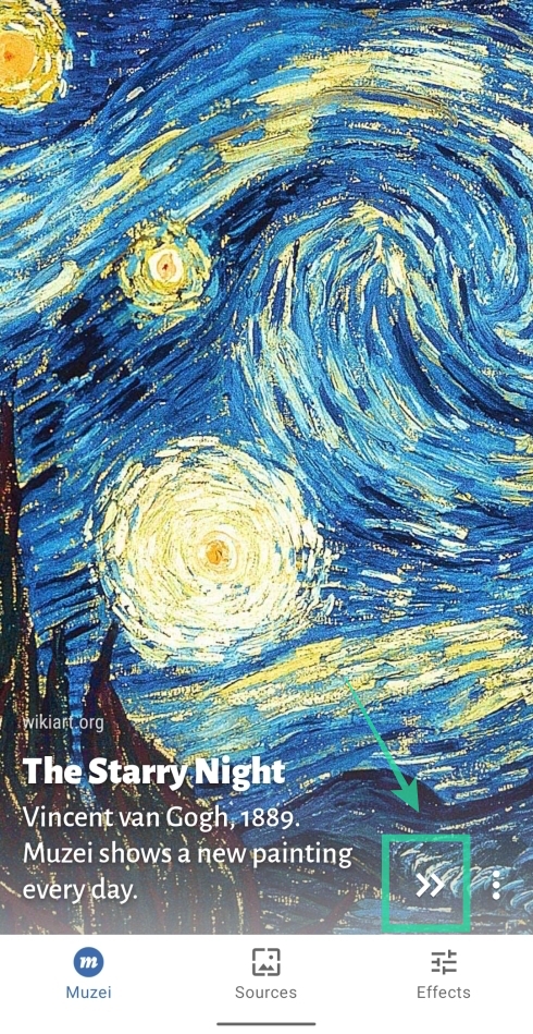 When inside the Muzei app’s home screen, you can tap on the double right arrow at the bottom to jump to the next artwork.