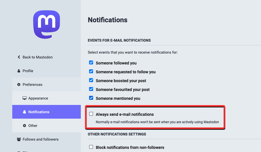 When you do that, Mastodon won’t send you emails when someone follows you, sends you a follow request, mentions you, favorites, or boosts your posts even when you’re inactive on the platform.
