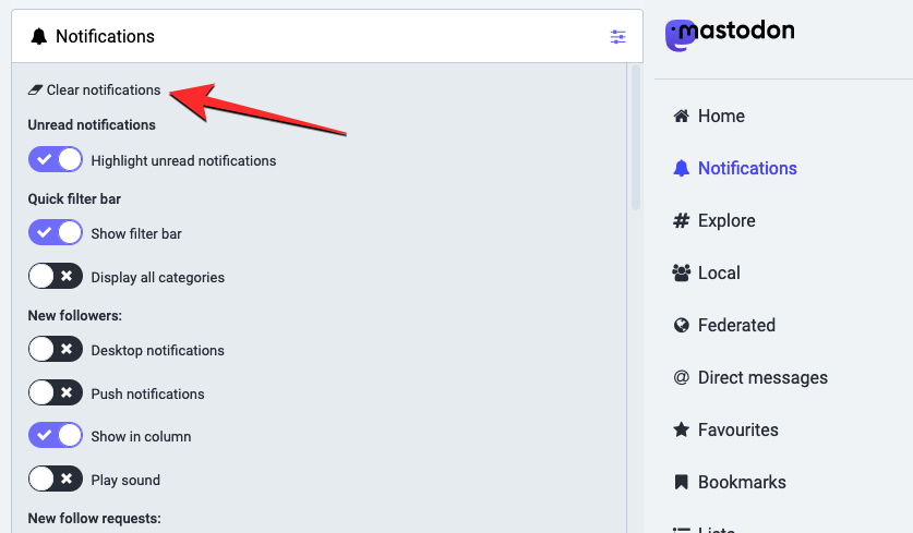 To clear notifications, open your Mastodon instance on a web browser and click on the Notifications tab on the right sidebar.