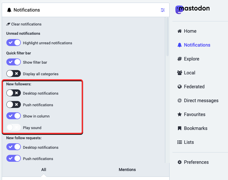 From here, you can customize how notifications come through for new followers and follow requests. To disable notifications completely when someone follows you, turn off the following toggles under “New followers:” – Desktop notifications, Push notifications, and Play sound.