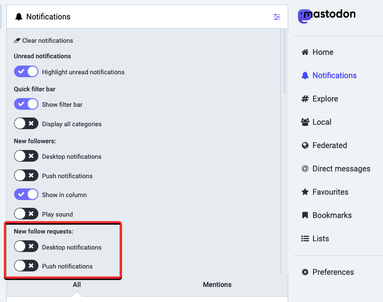 Similarly, you can also disable notifications when you receive a follow request from someone. To disable notifications for follow requests, turn off the Desktop notifications and Push notifications toggles under “New follow requests”.