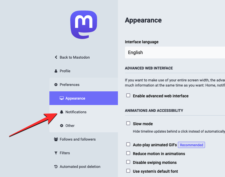 This will open the Appearance screen inside Mastodon. On this screen, click on the Notifications tab under “Preferences” on the left sidebar.