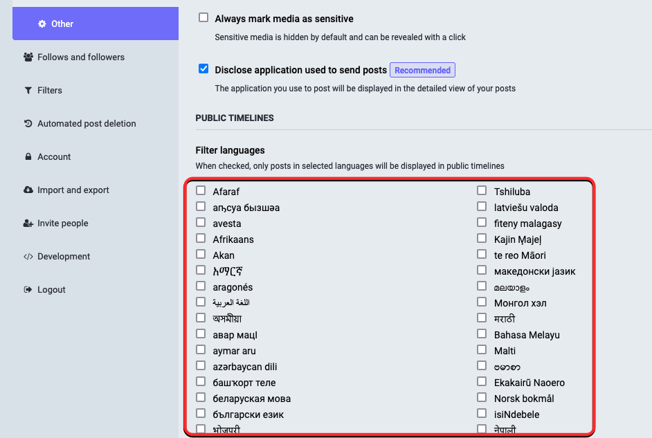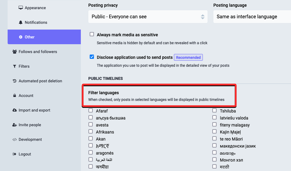 From the Filter languages section, check the boxes adjacent to your preferred language (the ones you want to view posts from). For instance, if you don’t read or speak any other language except English, you’ll select English from the Filter languages section. This way, all the other (unselected) languages will remain blocked on public timelines.