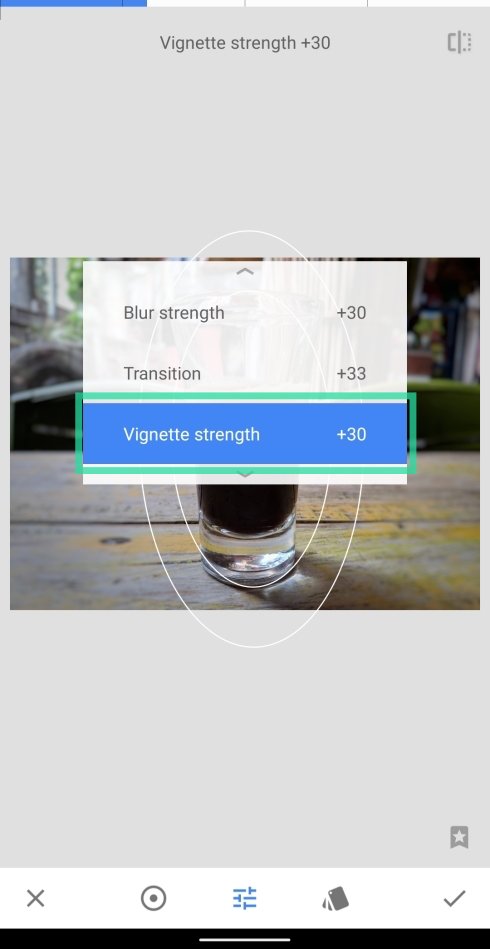 Step 13: Apply and adjust the Vignette effect to your blurred photo by swiping up on the screen till Vignette strength is highlighted and then swipe to left or right if you want to decrease or increase the intensity of the Vignette effect on the picture.