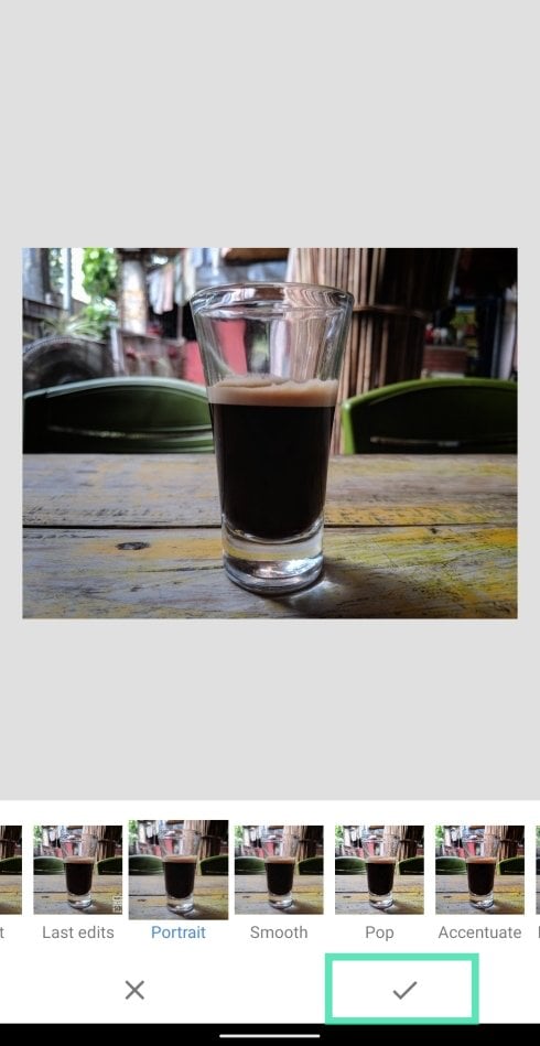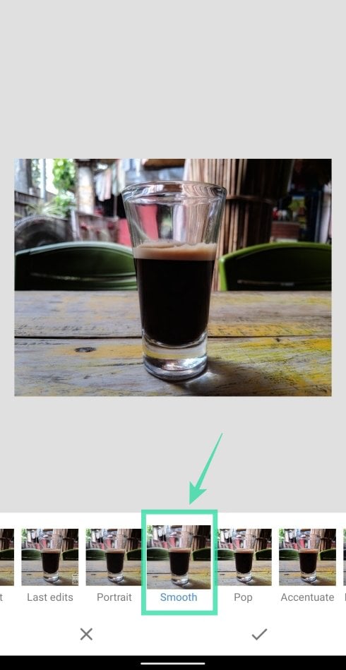 Step 5(optional): In order to make the subject look better with background blur, we recommend adding some more contrast and saturation to the image before moving on to giving it the blur effect. To do so, tap on the Styles tab, choose either Portrait or Smooth from the options and then tap on the tick mark at the bottom right to apply the style.