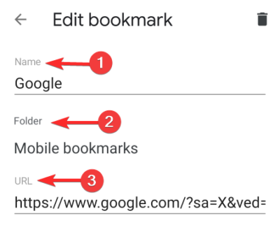 This will open the page with the bookmark information. Here you can edit the bookmark name, the bookmark folder, and the URL.