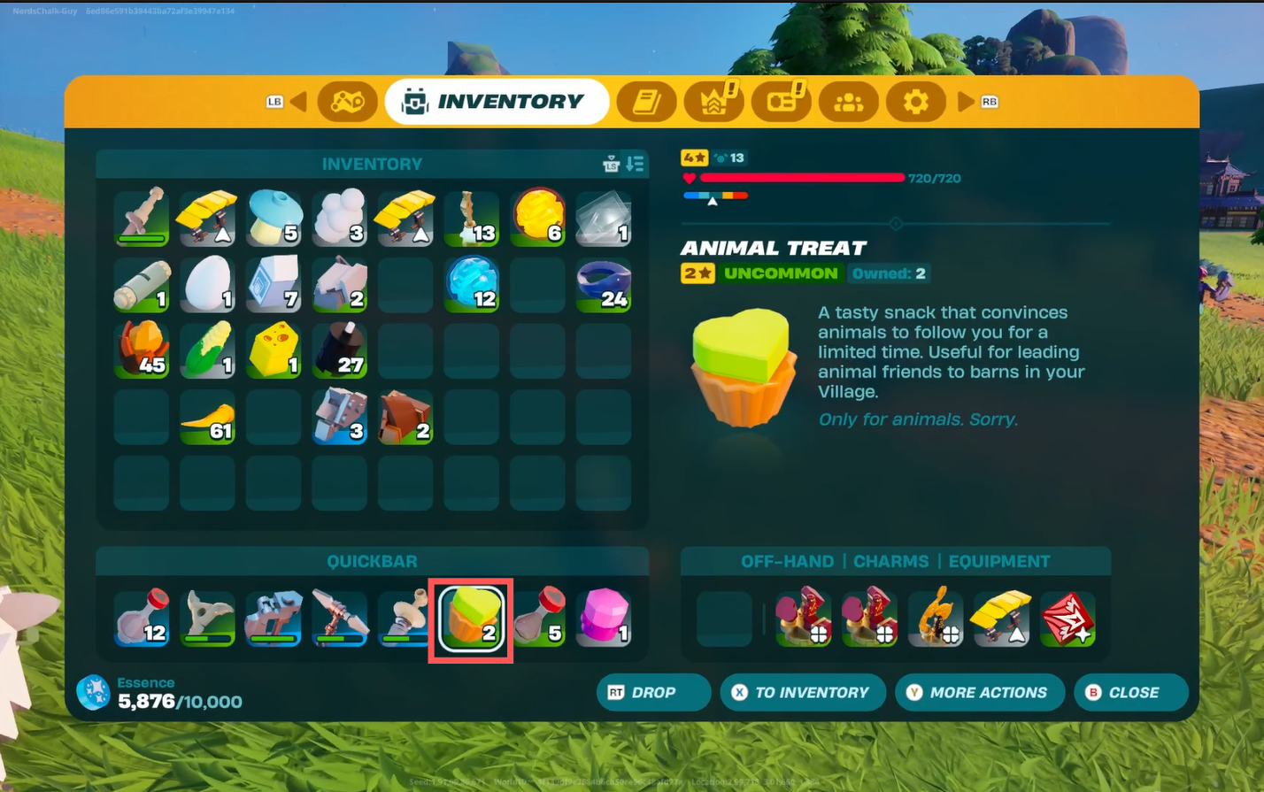 Once the Animal Treat is crafted, place it in your quickbar for easy access.
