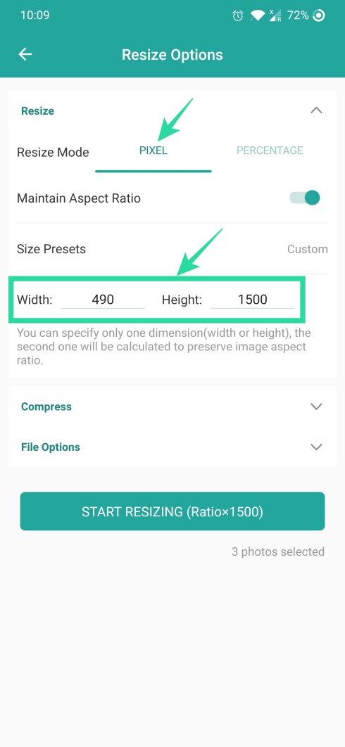 Step 5: Enter the Width and Height of the output image you wish to resize by Pixel size or select Percentage and use the slider to adjust the output size by percent.