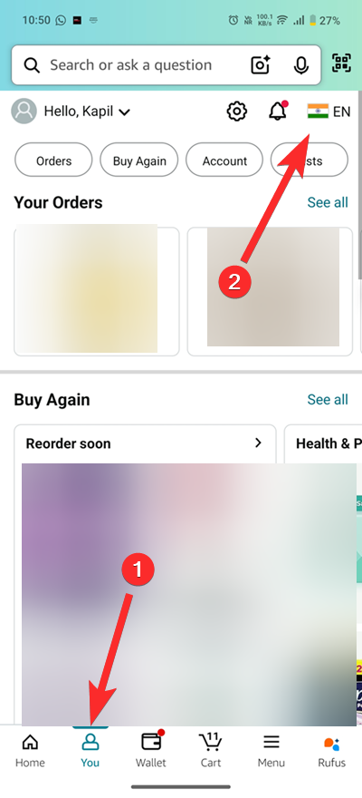 Open the Amazon app and then tap on the You button (second from left) in the bottom bar. Now, tap the flag icon in the top right to quickly change your country easily.