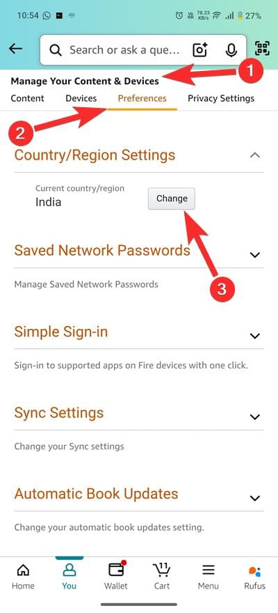 You can also find an opiton to change the country via Settings > Content Library > Preference > and then tap on Change under Country/Region Settings. Now, select the Address from your save addresses of the country you wish need to change to.