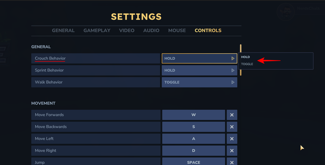 Under the general section, you’ll see the “Crouch Behavior” setting. You can choose between two modes: