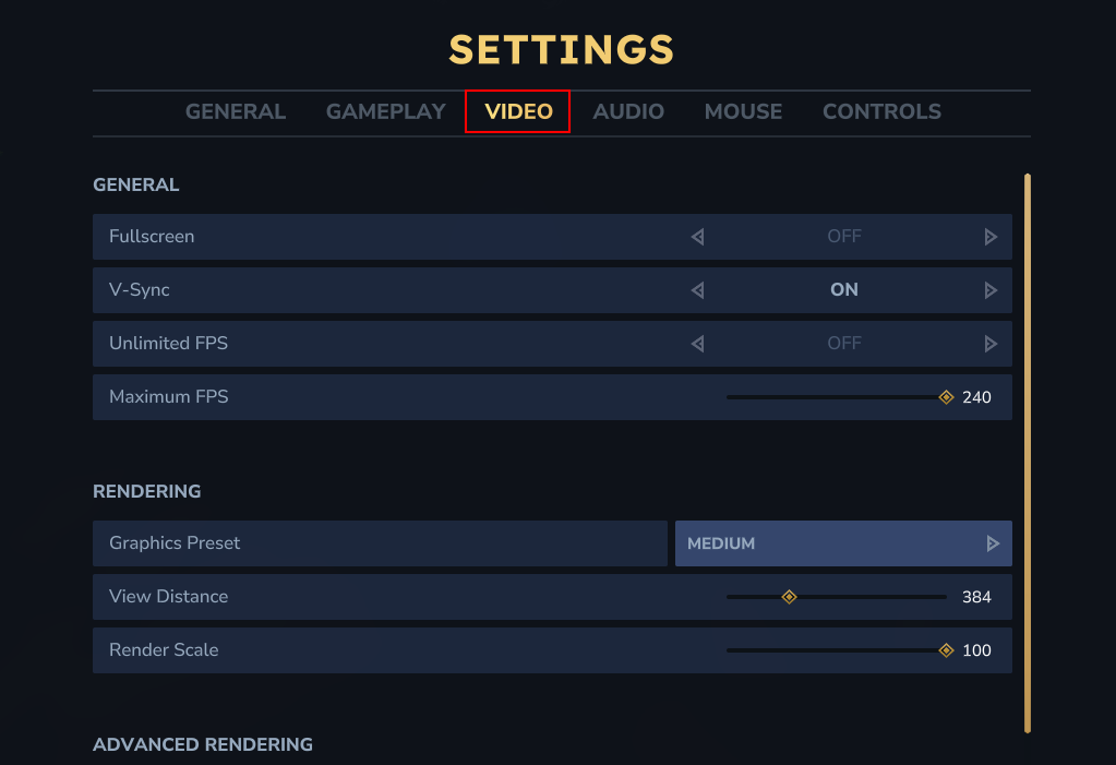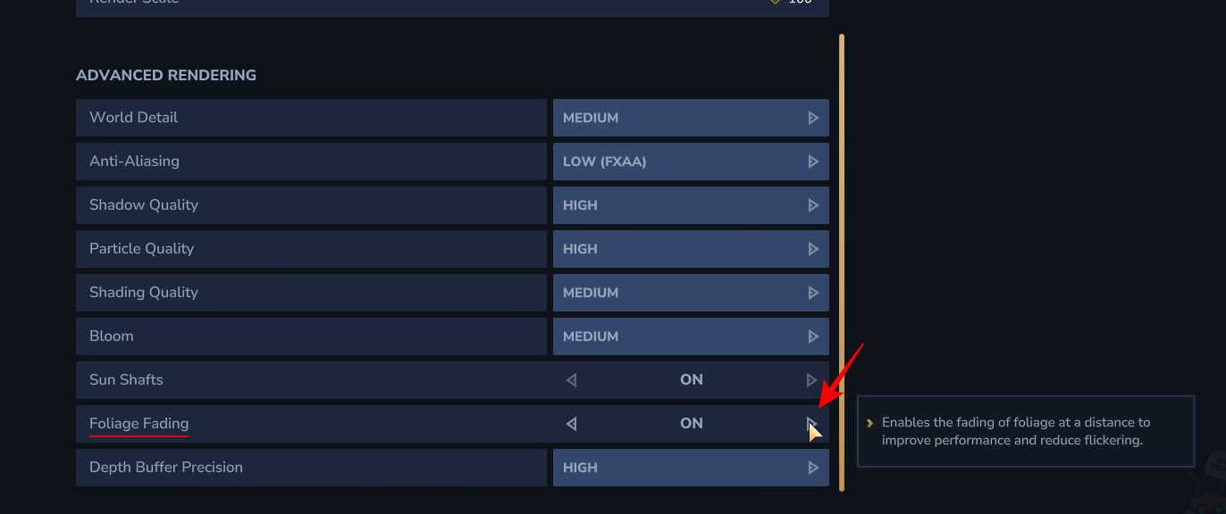 - Find the "Foliage Fading" setting under the advanced rendering section.