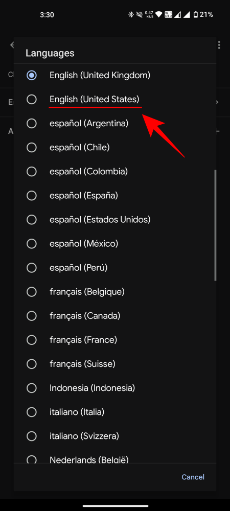 - Tap on the current language to change it. Select English (United States).