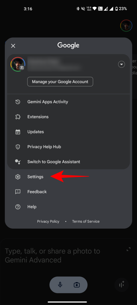 - Open the Gemini app, tap on the profile icon in the top right corner, and select Settings.