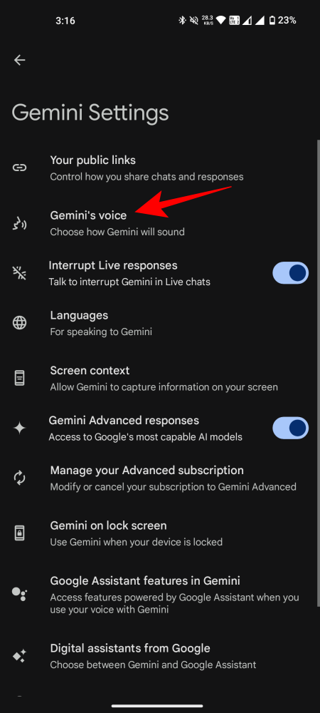 After this, return to the Gemini Settings (as shown before) and you’ll see the ‘Gemini’s voices’ option appear immediately.