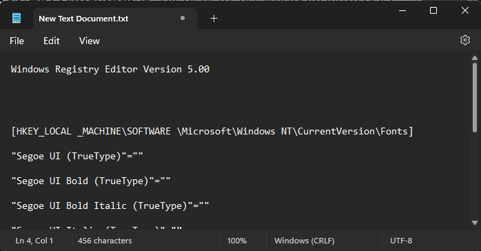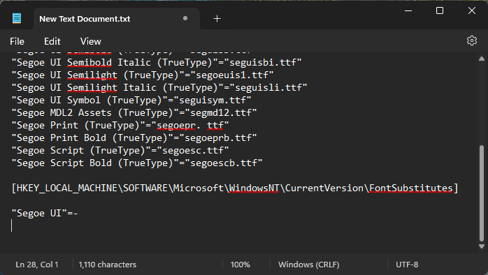 Windows Registry Editor Version 5.00[HKEY_LOCAL _MACHINE\SOFTWARE \Microsoft\Windows NT\CurrentVersion\Fonts]"Segoe UI (TrueType)"="""Segoe UI Bold (TrueType)"="""Segoe UI Bold Italic (TrueType)"="""Segoe UI Italic (TrueType)"="”"Segoe UI Light (TrueType)"="""Segoe UI Semibold (TrueType)"="”"Segoe UI Symbol (TrueType)"=""[HKEY_LOCAL _MACHINE\SOFTWARE\Microsoft\Windows NT\CurrentVersion\FontSubstitutes]"Segoe UI"= "NEW-FONT" - And paste it into the Notepad file.