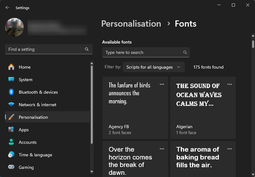 - You can also find fonts by searching for ‘Fonts’ in the Start menu.