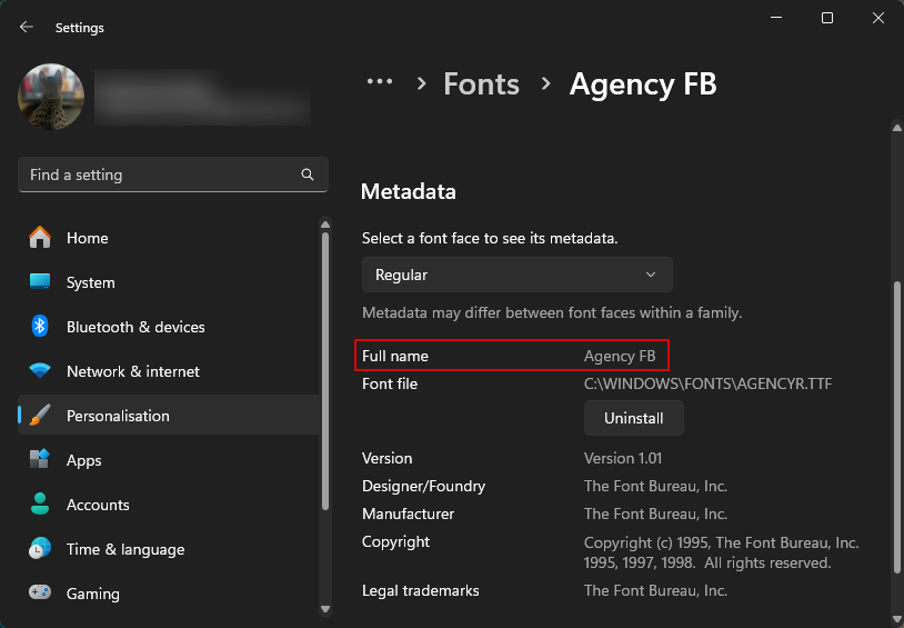 - Find an installed font from Settings > Personalization > Fonts (or download and install one of your liking) and note down its full name.