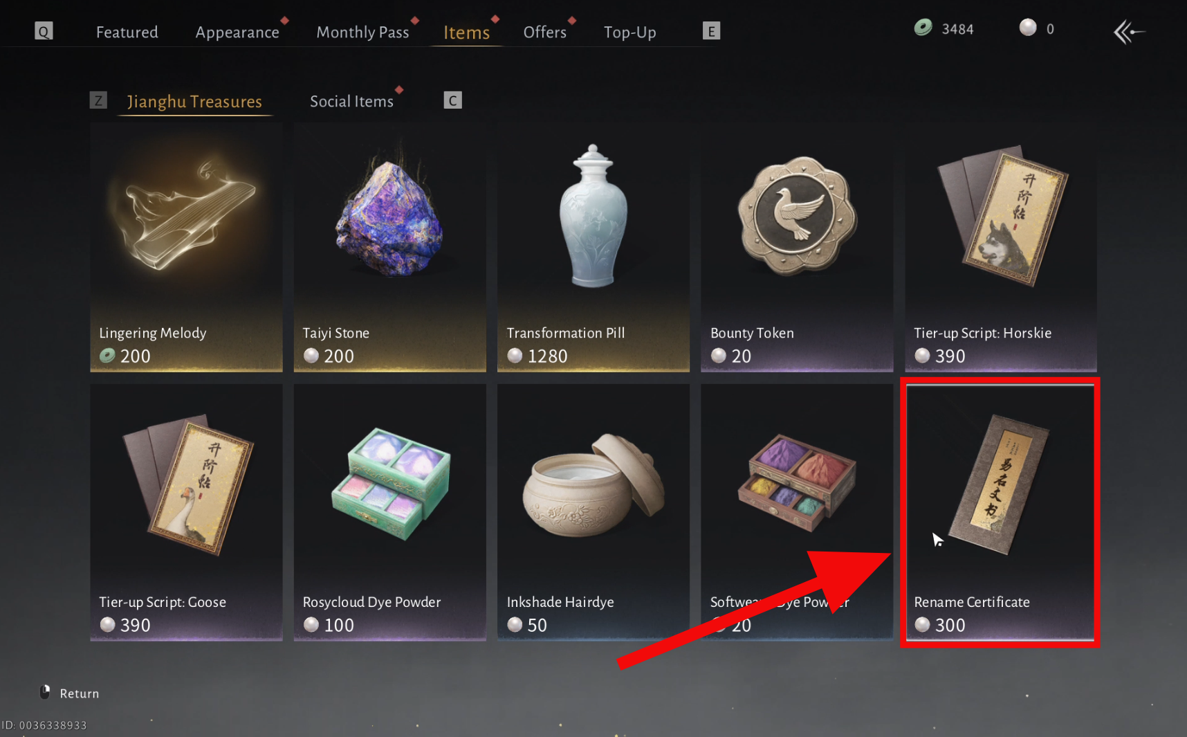 Buy a Rename Certificate from the Jianghu Treasures Shop using 300 Echo Beads.