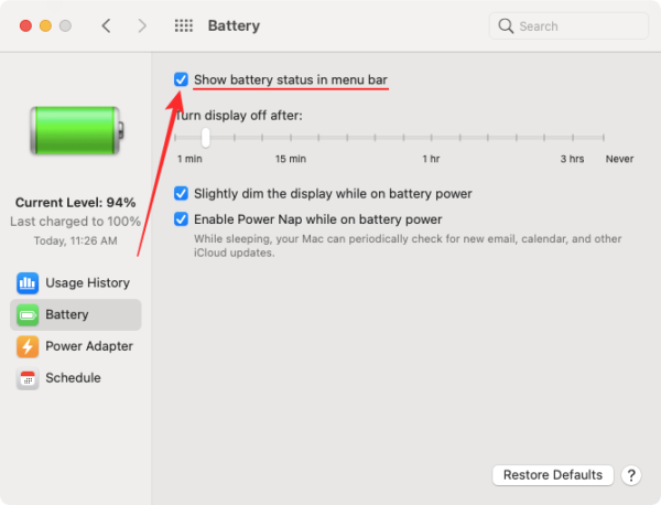The easiest way to check your MacBook’s battery health is by using the Menu bar that’s ever-present at the top of your desktop. You can do this if you have enabled Battery status to show on the Menu bar on your Mac. In case you have not, you can enable it by opening ‘System Preferences’ from the Dock, selecting the ‘Battery’ tile, clicking on the Battery tab from the left sidebar, and checking the ‘Show battery status in menu bar’ box.