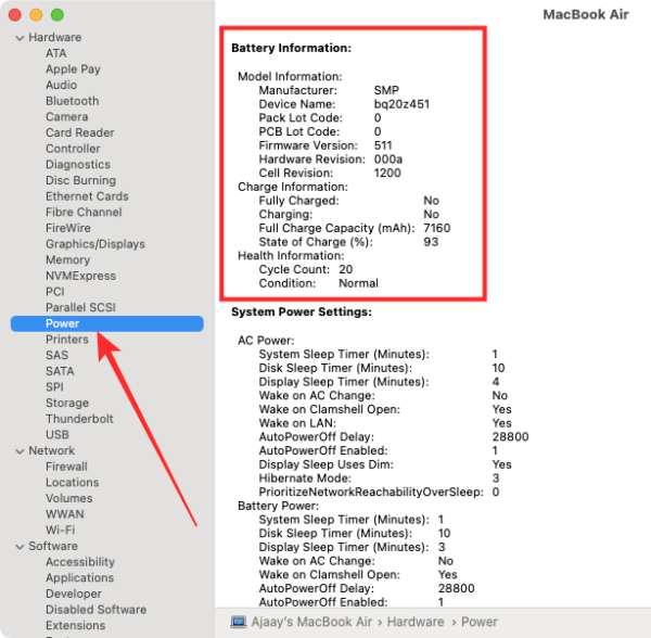 Inside the ‘System Report’ screen, click on the ‘Power’ option from the left sidebar.