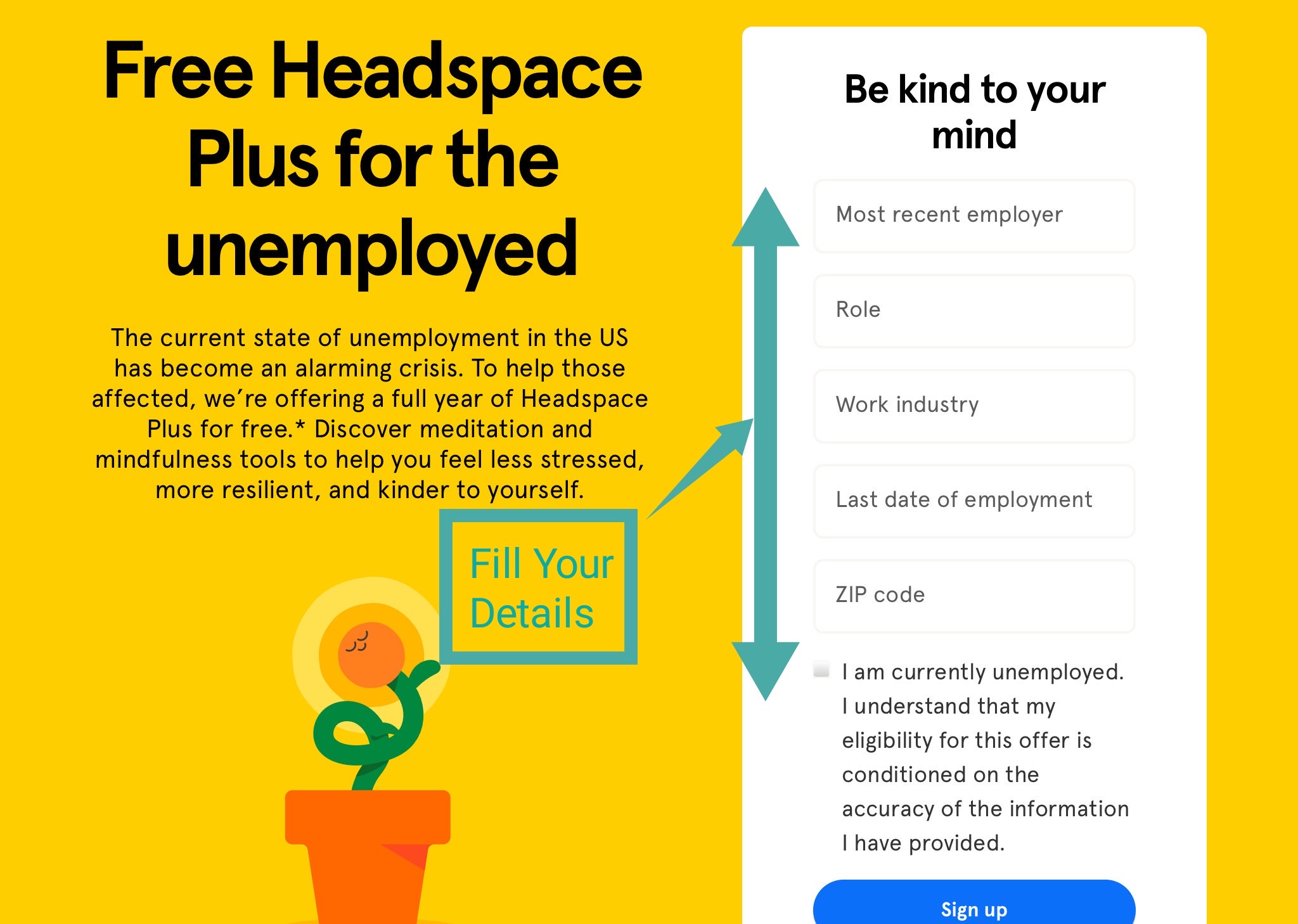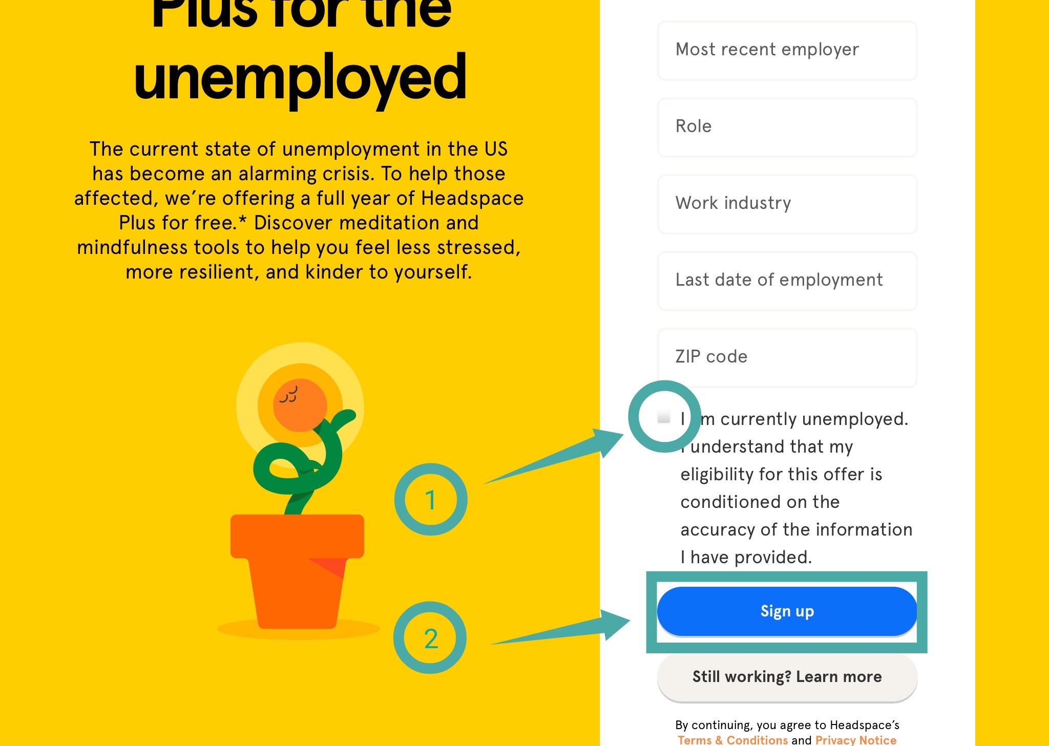 Step 3: Finally confirm your unemployment by checking the box for ‘I am currently unemployed. I understand that my eligibility for this offer is conditioned on the accuracy of the information I have provided.’ This will be your legal agreement with Headspace confirming that you are unemployed.