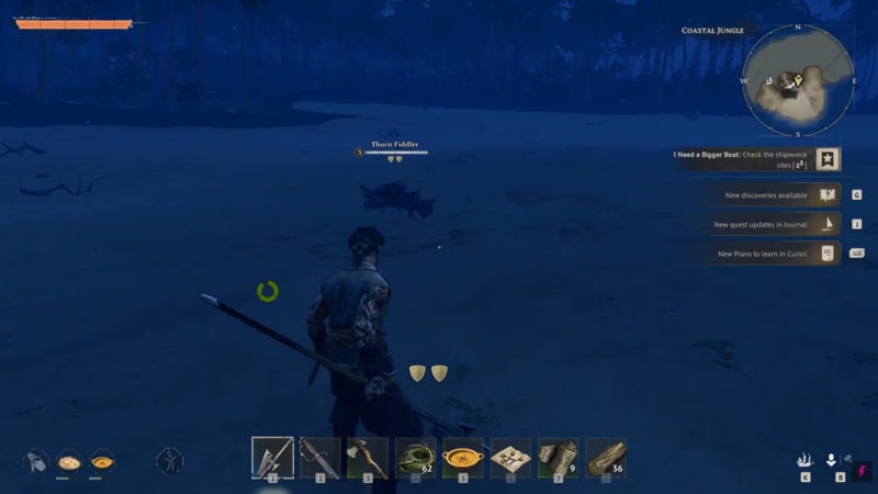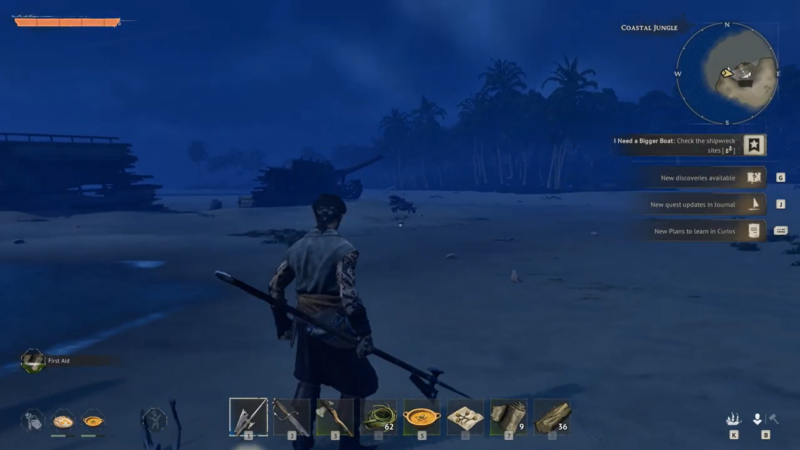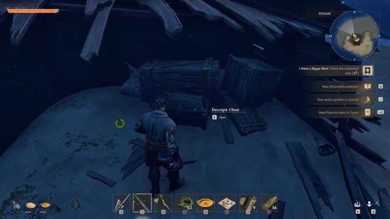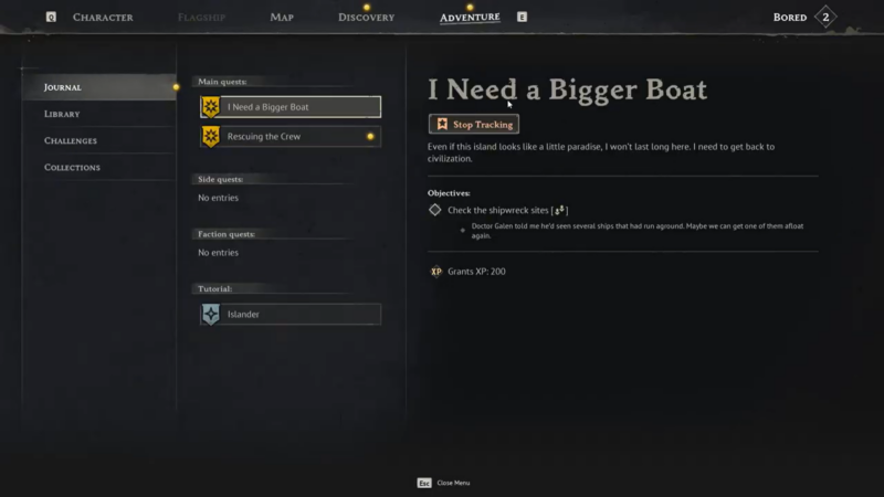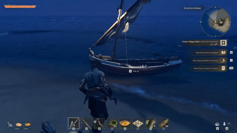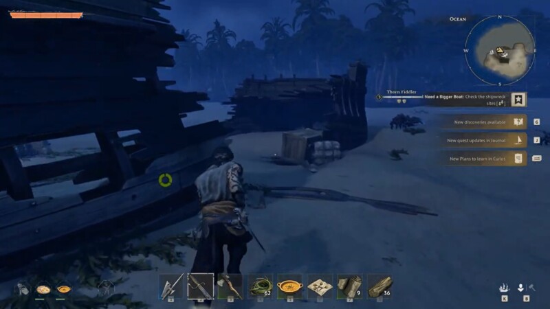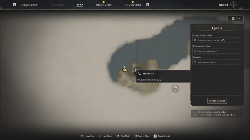 Activate or begin the “I Need a Bigger Boat” quest. This quest directs you to search for surviving vessels and expands your exploration range into deeper waters away from the starting island.