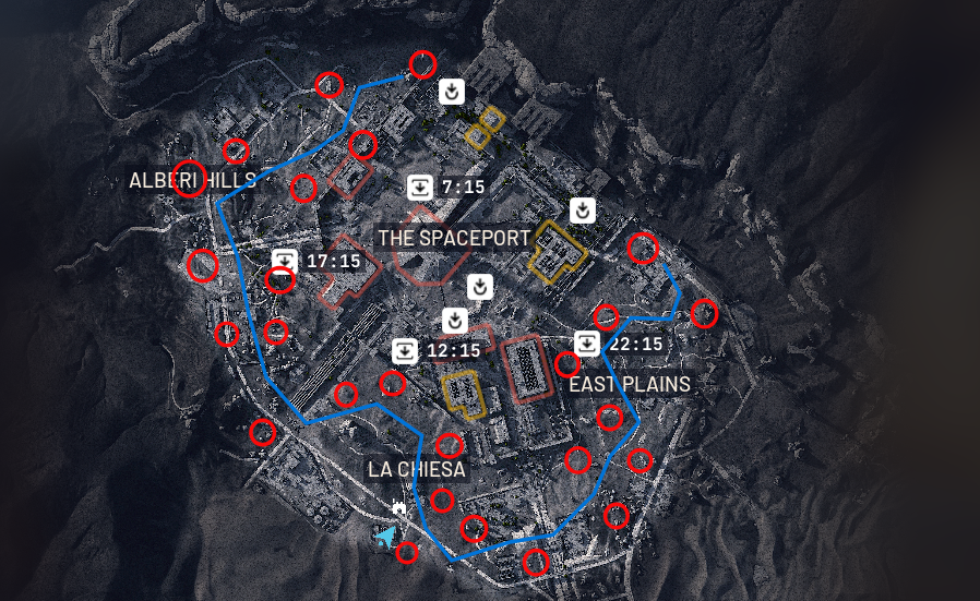 Raider Containers can appear on any map, but the Cold Snap map condition must be active. The best map for this Trial is Spaceport, where most containers are near the outskirts. Follow the route below to collect several of them efficiently.