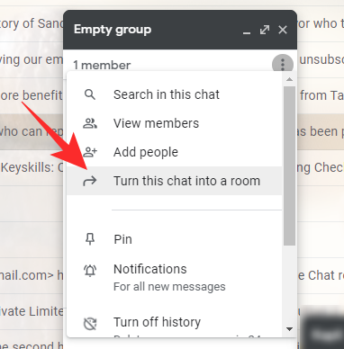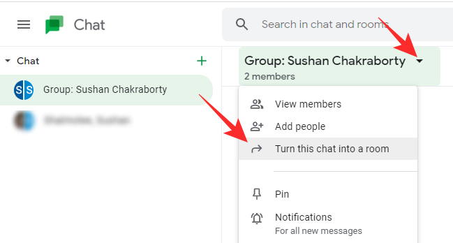 Click on it to expand the options. Next, click on the ‘Turn this chat into a room’ option.