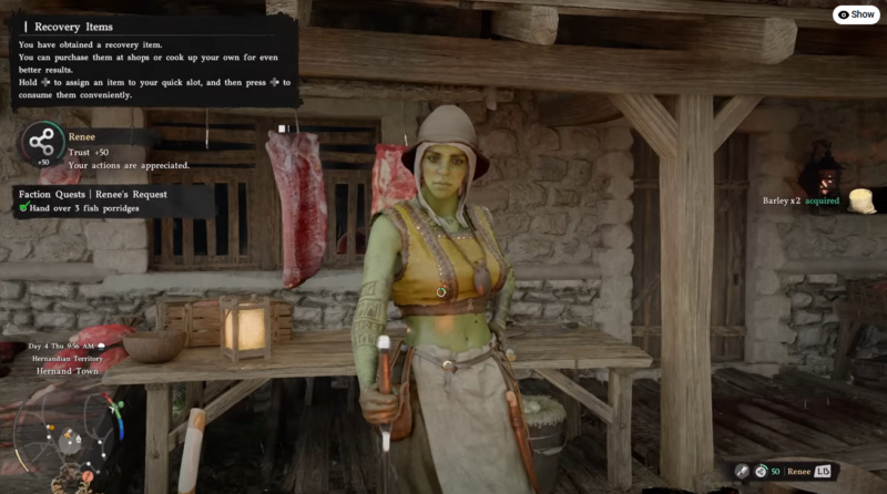 After that, head toward the meat vendor named Renee, who is located nearby within the town. When you speak to her, she’ll explain the need for fish porridge, setting up the main objective of the quest.